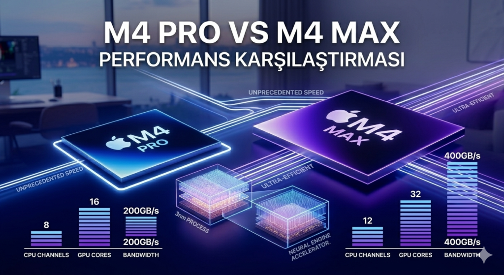 - M4 Pro ve M4 Max Çipleri: Daha da yüksek performans arayan kullanıcılar için M4 Pro ve M4 Max çipli MacBook Pro modelleri de satışa sunulacak. Bu çipler, daha fazla çekirdek ve daha yüksek bellek bant genişliğiyle en zorlu iş yüklerinin altından kalkacak. [Image comparing M4, M4 Pro, and M4 Max]